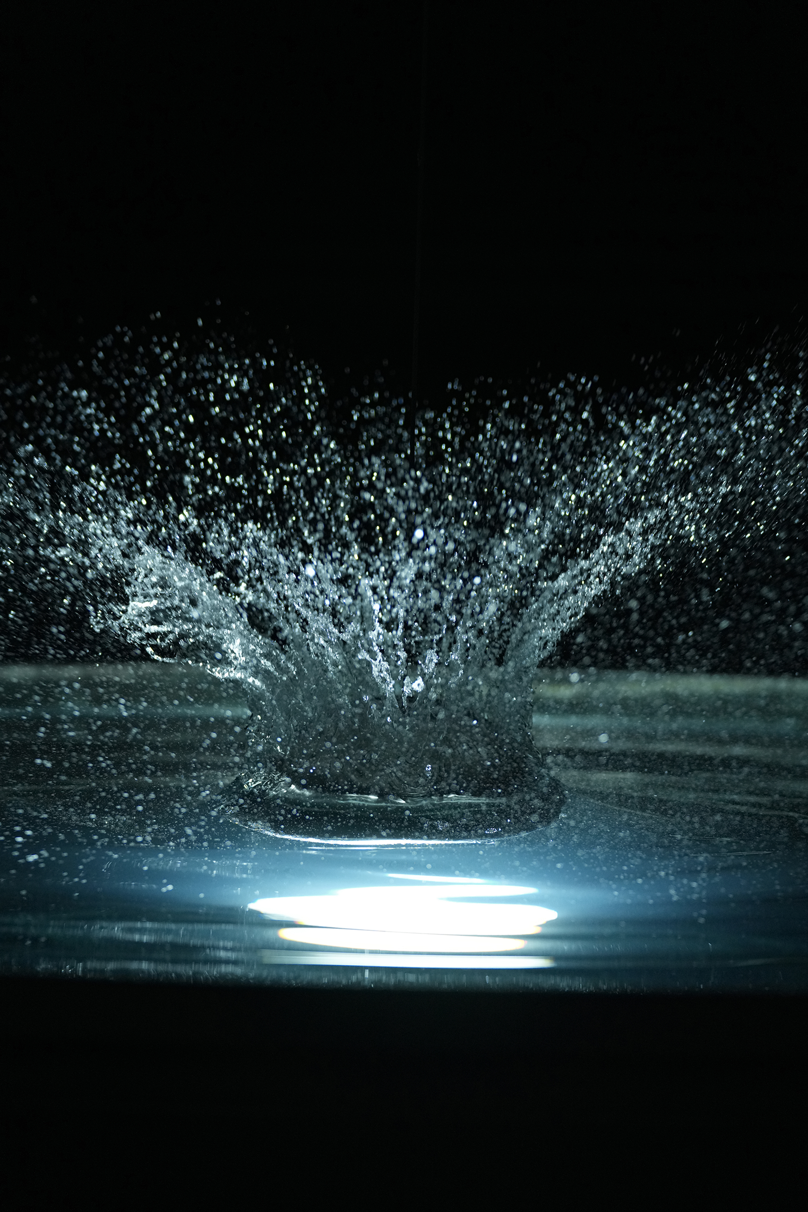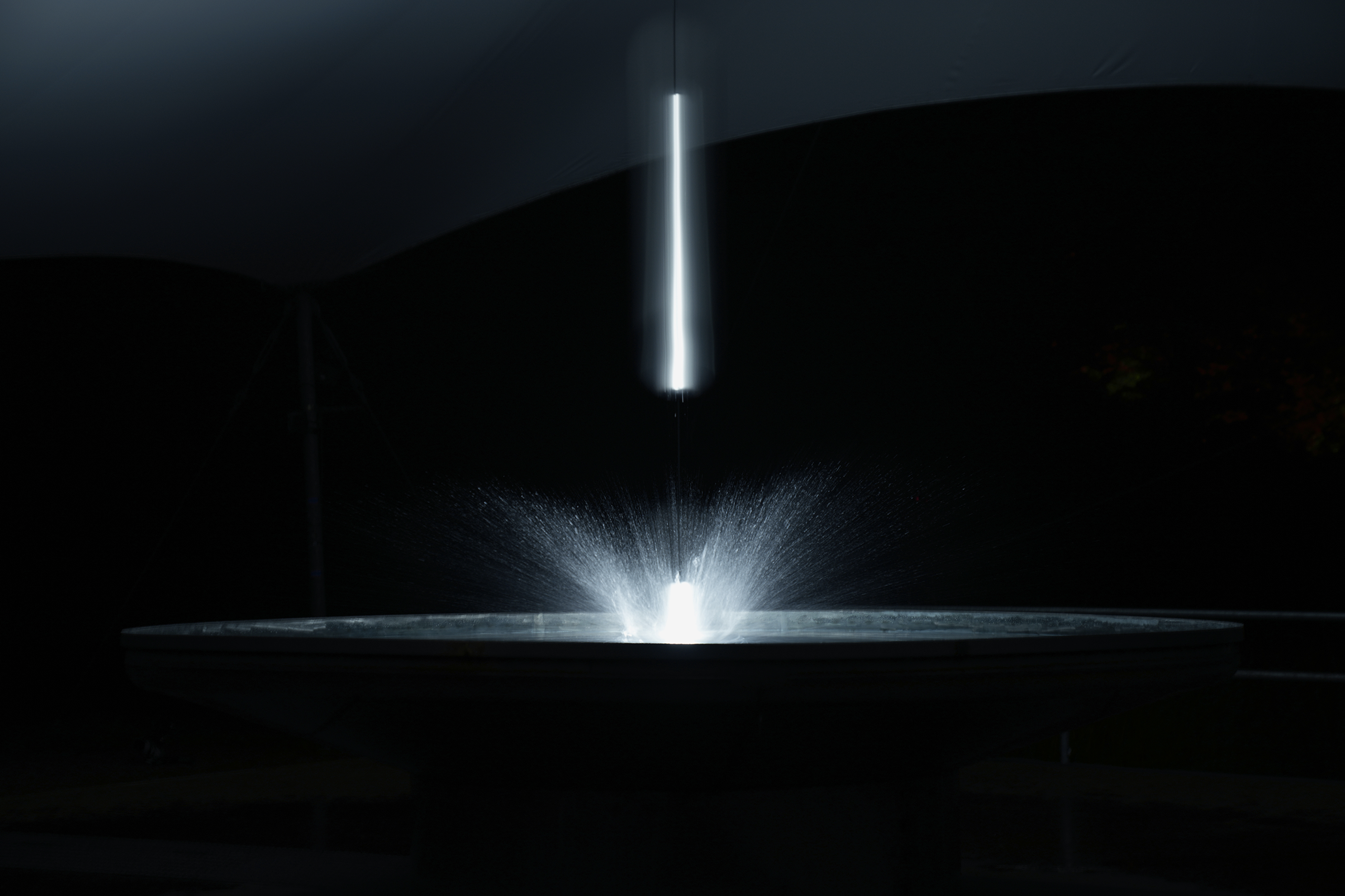 Kite places the viewer at the heart of his installations. Working at an architectural scale, he orchestrates light, sound, moving image, sculpture and performance to compose temporal spaces that disrupt the habitual and open up new modes of attention. The artwork embodies this approach: a sculptural intervention in which water, sound, light and architecture act together, transforming the theatre into a participant in the experience.