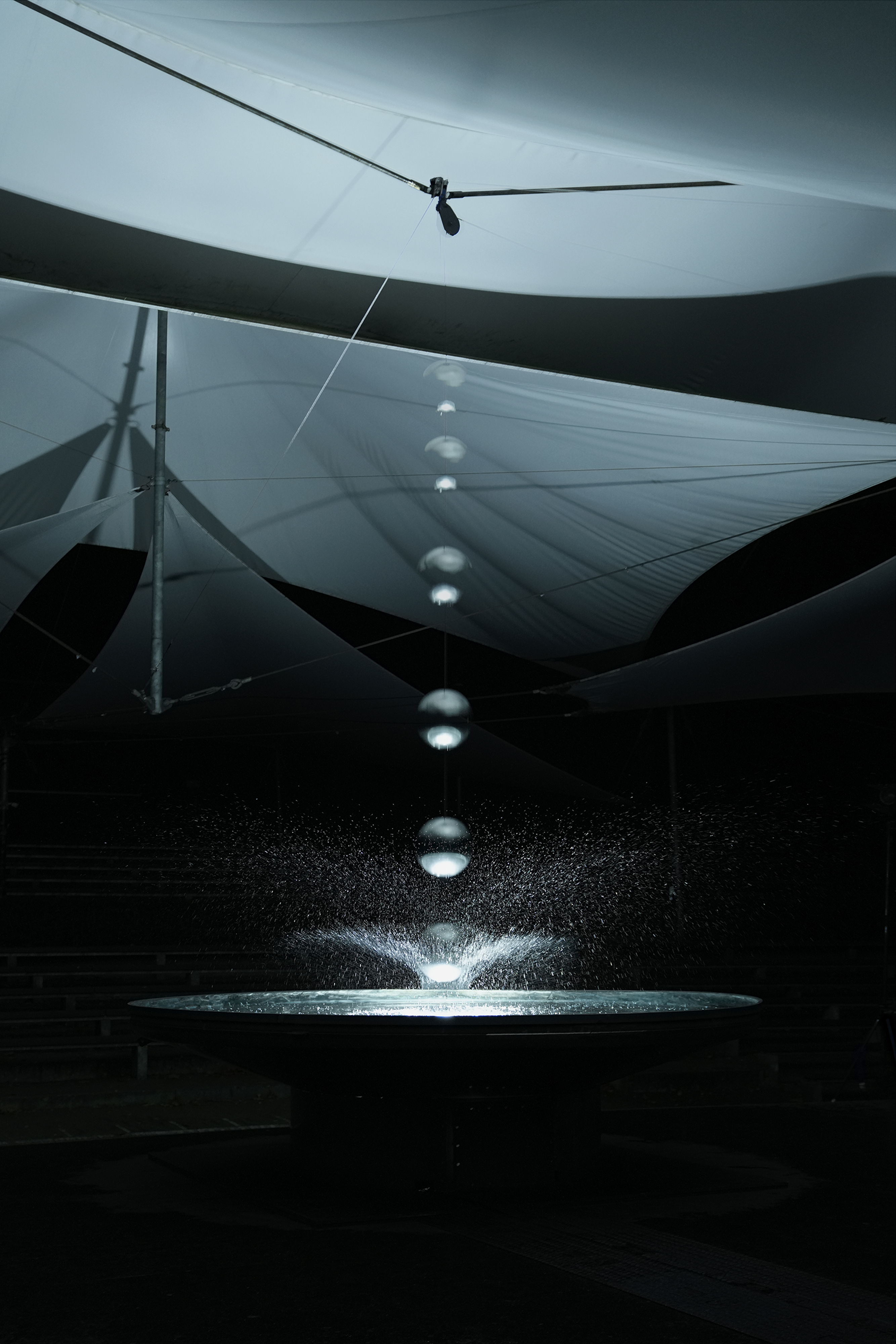 At its centre, a polished mirrored sphere hovers above a shallow reflecting pool. Suspended in air, it captures the surrounding architecture, poised between composure and imminent collapse. Then, without signal, it falls. Water breaks. Ripples surge. Mist rises. Light fractures and scatters across the space. And stillness returns—transformed, quietly charged with memory.